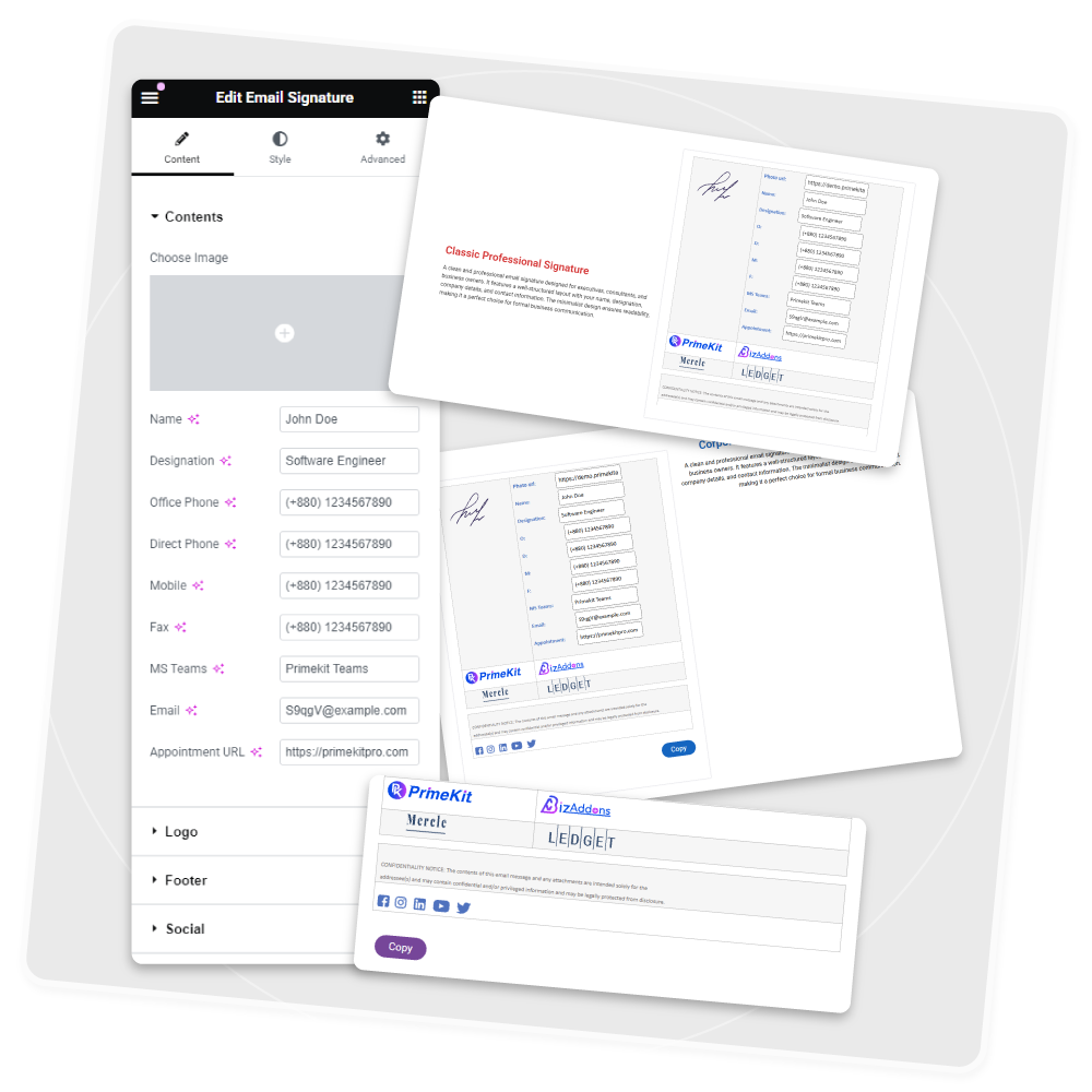 The Email Signature widget helps you create professional, branded email signatures that can be easily embedded into email clients.